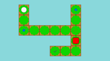 In the above GIF, the grey box represents a Stone, the pink circle represents a Bomb, and the darkened tile after the bomb is gone represents a Dirt Tile (or ditch). In this simple level, the player is moving to increase the fire, which spreads to the bomb tile, and explodes to destroy the stone. The bomb tile then becomes a Dirt tile, which prevents fire spreading like the water, but is not temporary. Now, the fire is actually useful for something and is essential for progressing to the next level!